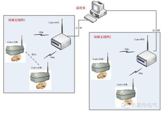 (1)如上圖所示,以Zigbee網(wǎng)關(guān)為KJT-SmartWireless無線主控節(jié)點,結(jié)合無線閥門裝置,共同組建了無線Mesh網(wǎng)絡(luò),實現(xiàn)了數(shù)據(jù)的互聯(lián)互通,并以以太網(wǎng)的方式匯聚到監(jiān)控室。
