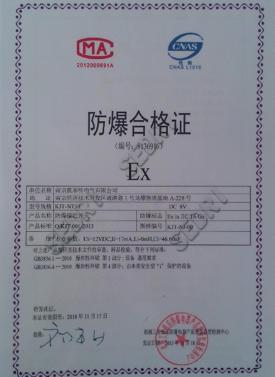 2013年11月18日,我公司生產(chǎn)的本安型接近開關(guān)(防爆接近開關(guān))取得了由國家防爆電氣產(chǎn)品質(zhì)量監(jiān)督檢驗中心開具的防爆證(證書編號:8130916 ),在此過程中公司按相關(guān)要求改善了部分生產(chǎn)工藝,對產(chǎn)品技術(shù)細節(jié)進行完善,保證了出廠產(chǎn)品的國家防爆要求。